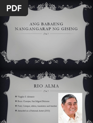 ALMARIO Si Virgilio Senadren Almario o mas kilala sa kanyang sagisag panulat na RIO ALMA ay 69 yrs. Ta na siyay aahonMula sa malansa at bukid ba basang liblib na nayonAOnomatopoeiaBAssonanceCAlliterationDNone of. The Woman who Daydreamed.